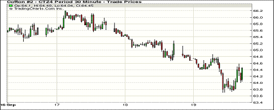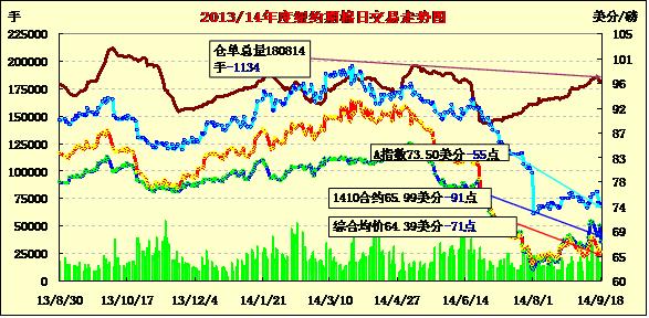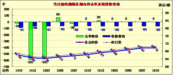 本周最后一個交易日,全球庫存預(yù)期增加仍是棉價下跌的最大推手,9月19日期棉繼續(xù)收跌;1410月合約結(jié)算價65.99美分/磅,跌91點;主力1412月合約結(jié)算價67.39美分/磅,跌66點;遠期1503月合約收于64.29美分/磅,跌67點。當日期棉開盤后繼續(xù)維持較弱走勢,盤終近期合約下跌91點,其他合約跌幅均在60-70點之間,主力合約最高漲至65.12美分/磅,此前6個交易日棉價5日下跌,跌幅達到370點;當日外部市場漲跌不一。上周美棉出口數(shù)據(jù)利空、新花采摘壓力、中國整體經(jīng)濟蕭條,以及棉花新政發(fā)布等因素均對棉價形成壓力,期棉市場利空消息不斷,預(yù)計后市仍有持續(xù)下跌可能。