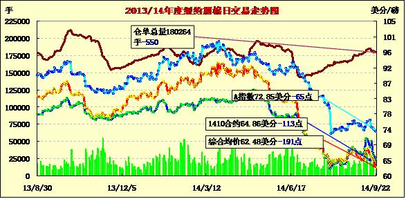 受壓于中國(guó)明年配額政策方面消息影響,紐約期棉市場(chǎng)大幅下跌,近期10月合約結(jié)算價(jià)64.86美分/磅,跌113點(diǎn),主力12月合約62.59美分,跌180點(diǎn),1503月合約61.59美分,跌234點(diǎn)。當(dāng)日市場(chǎng)交易呈現(xiàn)明顯跌勢(shì),主力12月合約早盤試圖穩(wěn)定在63.5美分以上,但交易中后期受壓下跌,最終在62美分處獲得支撐,收于62.59美分,回歸近五年低位水平。