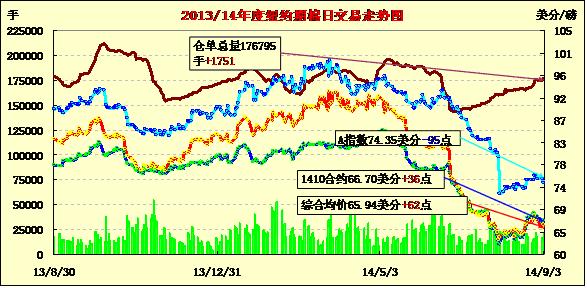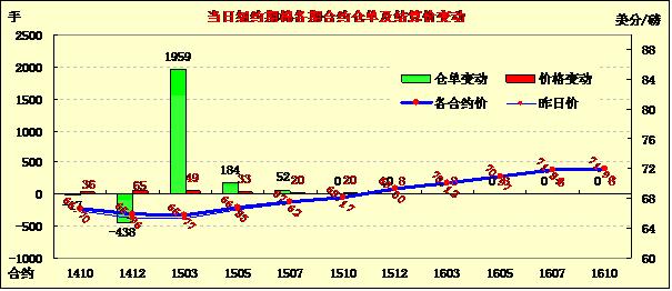 9月3日,即將公布的USDA月報(bào)預(yù)計(jì)將會小幅下調(diào)美棉產(chǎn)量,市場消費(fèi)買盤量增加,棉價(jià)普遍上漲;1410月合約結(jié)算價(jià)66.70美分/磅,漲36點(diǎn);主力1412月合約結(jié)算價(jià)65.96美分/磅,漲65點(diǎn);遠(yuǎn)期1503月合約收于65.77美分/磅,漲49點(diǎn)。當(dāng)日期棉開盤后小幅下跌并持續(xù)震蕩,主力12月合約在66美分/磅上下徘徊,最高漲至66.17美分/磅,盤終收漲65點(diǎn);外部商品市場,美元指數(shù)、小麥和油籽下跌,美股指數(shù)上漲。棉價(jià)結(jié)束三連陰小幅反彈,此前利空消息基本已被市場消化,預(yù)計(jì)后期將持續(xù)技術(shù)性調(diào)整。