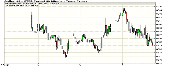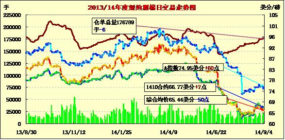 9月4日,由于新花上市增多,市場預(yù)期全球產(chǎn)量上升對棉價形成壓力,除近期合約微幅上漲外,紐約期棉普遍下跌;1410月合約結(jié)算價66.77美分/磅,漲7點;主力1412月合約結(jié)算價65.45美分/磅,跌51點;遠期1503月合約收于65.10美分/磅,跌67點。當(dāng)日期棉開盤后繼續(xù)上漲并突破前一日高點至66.45美分/磅,后市場投機性賣盤打壓棉價收陰告終;外部市場玉米、小麥和大豆下跌,美元指數(shù)上漲。由于全球產(chǎn)量和消費量未出現(xiàn)明顯變化,棉價在后市仍存在下行壓力。