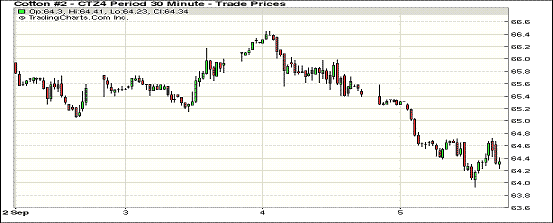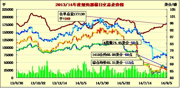 9月4日,由于新花上市增多,市場預(yù)期全球產(chǎn)量上升對棉價(jià)形成壓力,除近期合約微幅上漲外,紐約期棉普遍下跌;1410月合約結(jié)算價(jià)66.77美分/磅,漲7點(diǎn);主力1412月合約結(jié)算價(jià)65.45美分/磅,跌51點(diǎn);遠(yuǎn)期1503月合約收于65.10美分/磅,跌67點(diǎn)。當(dāng)日期棉開盤后繼續(xù)上漲并突破前一日高點(diǎn)至66.45美分/磅,后市場投機(jī)性賣盤打壓棉價(jià)收陰告終;外部市場玉米、小麥和大豆下跌,美元指數(shù)上漲。由于全球產(chǎn)量和消費(fèi)量未出現(xiàn)明顯變化,棉價(jià)在后市仍存在下行壓力。USDA美棉出口周報(bào)顯示,8.22-8.28一周美棉出口1.88萬噸,前一周下降66.5%,為新棉花年度來出口最低的一周。