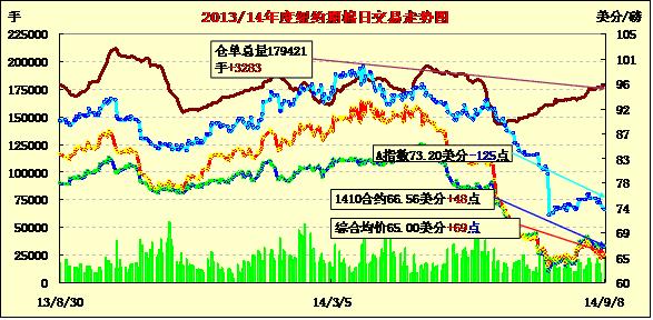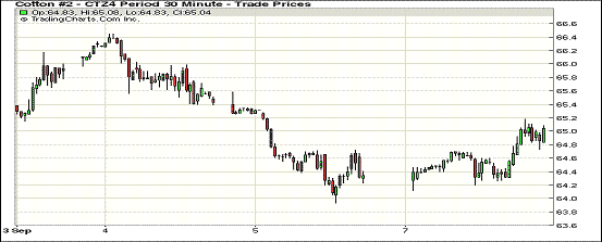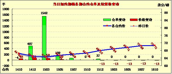 9月8日棉價近漲遠(yuǎn)跌;1410月合約結(jié)算價66.56美分/磅,漲48點(diǎn);主力1412月合約結(jié)算價65.05美分/磅,漲74點(diǎn);遠(yuǎn)期1503月合約收于64.73美分/磅,漲59點(diǎn)。當(dāng)日期棉開盤后普遍上漲,午盤后漲至高點(diǎn),盤終近期合約收漲,遠(yuǎn)期合約下跌,12/3月價差32點(diǎn),上周五為17點(diǎn);谷物與油籽期貨上漲。