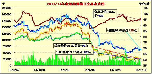 周一美國(guó)農(nóng)業(yè)部最新預(yù)測(cè)發(fā)布,紐約期棉全線下跌,主力合約再次跌破60美分;主力1503月合約結(jié)算價(jià)59.73美分/磅,跌103點(diǎn),1505月合約收于60.42美分/磅,跌93點(diǎn)。當(dāng)日主力合約低開(kāi),全天走勢(shì)萎靡,午后跳水式下跌,最高點(diǎn)60.75,低于上個(gè)與交易日收盤(pán)價(jià)1點(diǎn),收盤(pán)創(chuàng)6個(gè)交易日來(lái)最低價(jià)。3/5月合約價(jià)差59點(diǎn)。當(dāng)日主力合約低開(kāi),全天走勢(shì)萎靡,午后跳水式下跌,最高點(diǎn)60.75,低于上個(gè)與交易日收盤(pán)價(jià)1點(diǎn),收盤(pán)創(chuàng)6個(gè)交易日來(lái)最低價(jià)。3/5月合約價(jià)差59點(diǎn)。