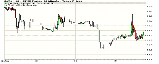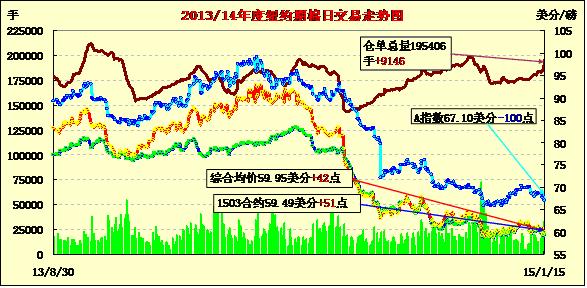 周四美棉出口數(shù)據(jù)強勁,在此刺激下,紐約期棉反彈回升;主力1503月合約結(jié)算價59.49美分/磅,漲51點,1505月合約收于60.27美分/磅,漲44點。當(dāng)日主力合約高開,隨后在59.20-59.40區(qū)間內(nèi)震蕩,受到出口數(shù)據(jù)刺激后短時間內(nèi)迅速上漲,最高價60.27美分,之后穩(wěn)健回落。3/5月合約價差78點。周四USDA出口數(shù)據(jù)顯示上周美棉出口,創(chuàng)本年度新高。