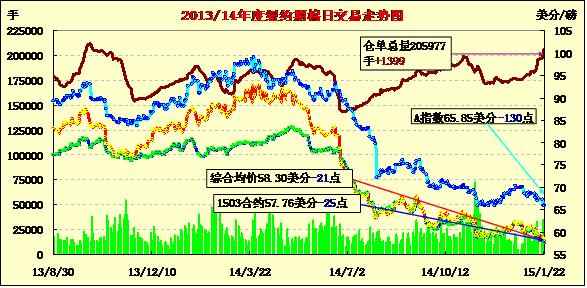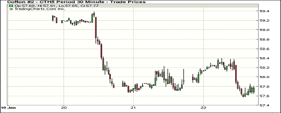 1月22日紐約期棉下跌,合約價下跌均在20點左右,3/5月合約再創(chuàng)新低;1503月合約結(jié)算價57.76美分/磅,跌25點,1505月合約收于58.65美分/磅,跌23點。當(dāng)日期棉缺乏刺激,3月合約開盤后窄幅震蕩,午后開始下跌,并與格林威治時間15點35分跌破57.67,隨后繼續(xù)下跌,最低價57.58,為5年來最低。