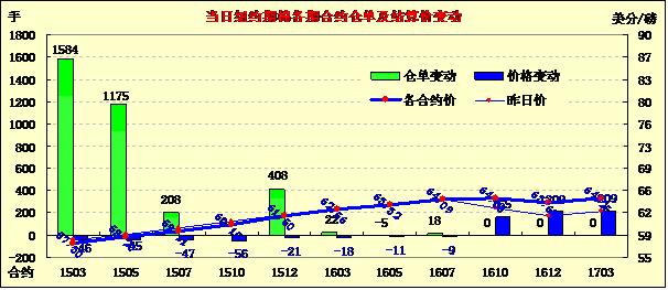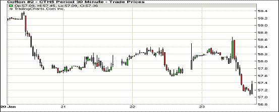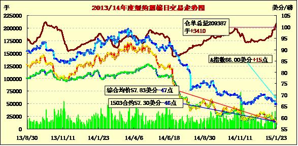 1月23日美棉出口數(shù)據(jù)發(fā)布,紐約期棉走勢先揚后抑,主力合約再創(chuàng)新低;1503月合約結(jié)算價57.30美分/磅,跌46點,1505月合約收于58.20美分/磅,跌45點。當日開盤后期棉受美棉出口影響上漲,最高價58.67,但不久后下跌,盤終收于新低,最低價57.05。3/5月合約價差90點。周五美棉出口數(shù)據(jù)強勁,但ICE期棉不漲反跌,市場可能迎來一波新的頹勢。此外,美元不斷走強,也對未來美棉的出口帶來一定阻礙。