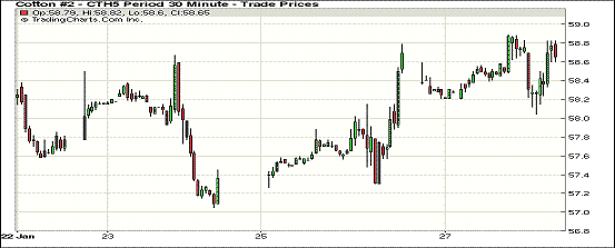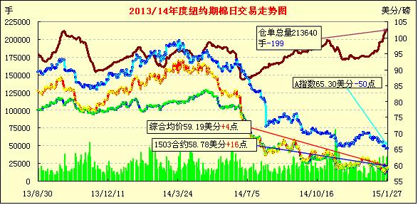 1月27日印度CCI公司首日拋儲,紐約期棉近月合約小幅上漲;1503月合約結(jié)算價58.78美分/磅,漲16點,1505月合約收于59.54美分/磅,漲9點。當(dāng)日開盤后3月合約價保持穩(wěn)定,之后小幅下跌,最低價58.04美分/磅,之后開始攀升,當(dāng)日漲幅0.27%。27日印度CCI 公司首日拋儲,但相比市場價較高,期棉不跌反漲。未平倉合約打破9日來不斷上漲的趨勢。