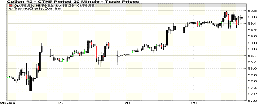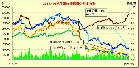16日至22日當(dāng)周美棉簽約12萬余噸,受此刺激紐約期棉近月合約繼續(xù)小幅上漲;1503月合約結(jié)算價59.57美分/磅,漲13點(diǎn),1505月合約收于60.35美分/磅,漲12點(diǎn)。當(dāng)日3月合約低開,不久后美棉出口數(shù)據(jù)發(fā)布,ICE期棉迅速結(jié)束弱勢開始上漲,午后震蕩幅度較大,最終漲幅0.22%。至1月22日當(dāng)周美棉12余萬噸,再次創(chuàng)下年度新高,至22日,1月美棉累計簽約在150萬包左右,但對ICE期棉刺激有限,當(dāng)日近月合約漲幅較小,遠(yuǎn)月合約下跌。