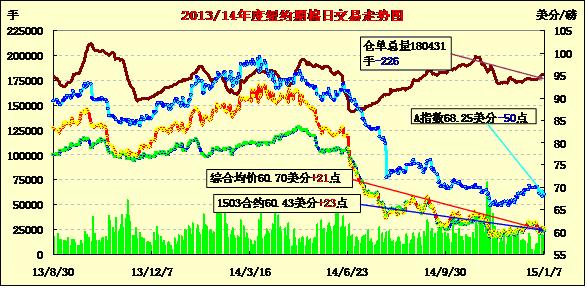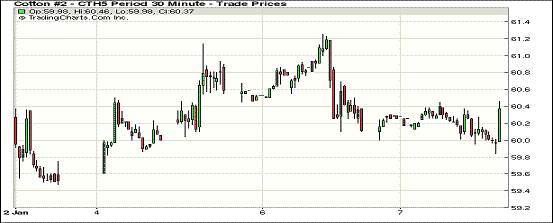 1月7日,除1603合約外,紐約期棉小幅反彈;1503月合約結(jié)算價(jià)60.43美分/磅,漲23點(diǎn),主力1505月合約收于60.91美分/磅,漲15點(diǎn)。當(dāng)日主力合約低開,全天走勢(shì)窄幅震蕩,最高點(diǎn)60.52美分,盤尾回落至震蕩區(qū)間高位。3/5月合約價(jià)差縮小。