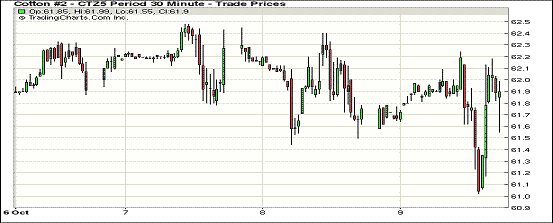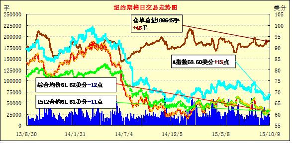 10月9日紐約期棉先揚(yáng)后抑,結(jié)算價(jià)小幅下跌;1512月合約結(jié)算價(jià)61.61美分/磅,跌11點(diǎn),1603月合約61.53美分,跌7點(diǎn)。即本周期棉大漲之后,ICE期棉再次進(jìn)入調(diào)整格局,周五12月合約低開(kāi)后走勢(shì)稍強(qiáng),收盤(pán)時(shí)小幅下跌。本月最新的美國(guó)農(nóng)業(yè)部報(bào)告調(diào)減2015/169年度美棉單產(chǎn),種植面積未作改變,美棉年度總產(chǎn)量調(diào)減2萬(wàn)噸,至290.4萬(wàn)噸。