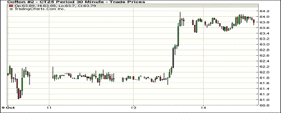 10月14日紐約期棉小幅回落調(diào)整,價(jià)格波動(dòng)不大;1512月合約結(jié)算價(jià)63.76美分/磅,跌10點(diǎn),1603月合約63.64美分,跌6點(diǎn)。當(dāng)日12月合約平開,早間走勢(shì)稍弱并窄幅震蕩,后半場(chǎng)交易中上漲,并于賣盤壓力回歸前沖高,再一次站上64.00美分/磅。經(jīng)過周二大漲后,周三期棉缺乏上行動(dòng)力,最終小幅收跌。目前市場(chǎng)依然擔(dān)憂中國(guó)消費(fèi)市場(chǎng),但印度棉花公司已于本周開始收購(gòu)新花,同時(shí)美棉量質(zhì)齊降,棉價(jià)可找到支撐。