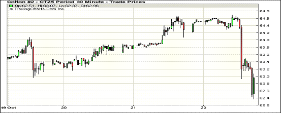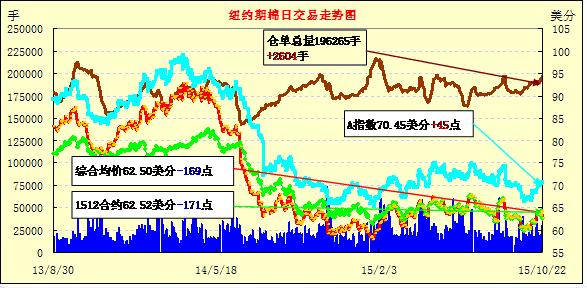 10月22日,受美元指數(shù)上漲,紐約期棉獲利回吐,所有合約大幅收跌;1512月合約結(jié)算價(jià)62.52美分/磅,跌171點(diǎn),1603月合約62.37美分,跌168點(diǎn)。當(dāng)日主力合約最高漲至64.69美分/磅,后遇阻力下探。后半場交易時賣盤打壓,買盤觀望,合約價(jià)下跌。周四公布的美棉最新出口顯示,截至15日當(dāng)周,美棉新花簽約量穩(wěn)定,本年度美棉簽約已達(dá)預(yù)計(jì)簽約總量的36%。當(dāng)日德州平原繼續(xù)降雨,但預(yù)計(jì)周五放晴。