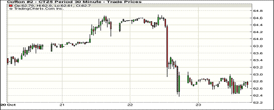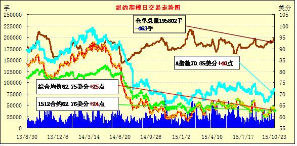 10月23日,紐約期棉小幅反彈收漲;1512月合約結(jié)算價(jià)62.76美分/磅,漲24點(diǎn),1603月合約62.60美分,漲23點(diǎn)。當(dāng)日12月合約高開,之后短暫保持漲勢(shì),最高至63.07美分/磅,下半場(chǎng)交易時(shí)下跌,最終小幅收漲。隨著新棉上市進(jìn)度的加快,市場(chǎng)高等級(jí)棉的短缺越發(fā)明顯,日前德州降雨并沒有預(yù)期的嚴(yán)重,但依然對(duì)新花質(zhì)量造成影響。