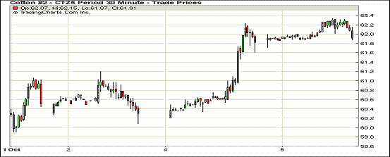 10月6日美元指數(shù)下跌,紐約期棉繼續(xù)上漲;1512月合約結(jié)算價62.08美分/磅,漲21點,1603月合約61.85美分,漲17點。當(dāng)日主力合約高開全天價格走勢波動較小,最高價62.33美分/磅,最低61.71美分/磅。