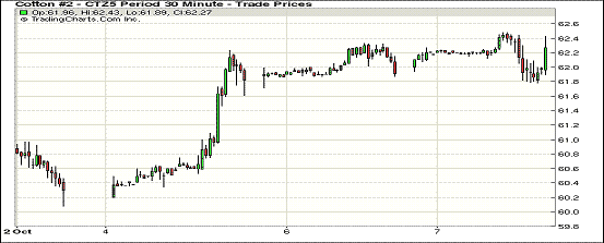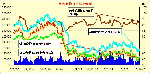 10月7日紐約期棉大部分合約價(jià)穩(wěn)定并收漲;1512月合約結(jié)算價(jià)62.05美分/磅,跌3點(diǎn);1603月合約收于61.95美分/磅,漲10點(diǎn)。 當(dāng)日主力合約早間交易平穩(wěn),價(jià)格窄幅波動(dòng),盤中沖高后回落,最低價(jià)接近61.80美分/磅,收盤前回升。市場(chǎng)關(guān)注本周發(fā)布的美國(guó)農(nóng)業(yè)部預(yù)測(cè),若無重大利空消息,棉價(jià)可能持續(xù)反彈。
