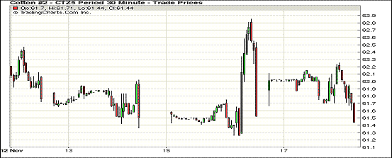 11月17日,紐約期棉放量持穩(wěn),主力合約全天走勢(shì)樂觀;1512月合約結(jié)算價(jià)61.53美分/磅,跌21點(diǎn),1603月合約62.67美分,漲6點(diǎn)。當(dāng)日主力合約走勢(shì)全天呈陽(yáng),盤中雖賣盤壓力較大但價(jià)格穩(wěn)定,收盤價(jià)基本持平。本周美國(guó)惡略天氣進(jìn)一步影響棉花采收和質(zhì)量,雖然銷售進(jìn)度落后,但美棉庫(kù)存處于低位使其面臨的銷售壓力大幅下降。