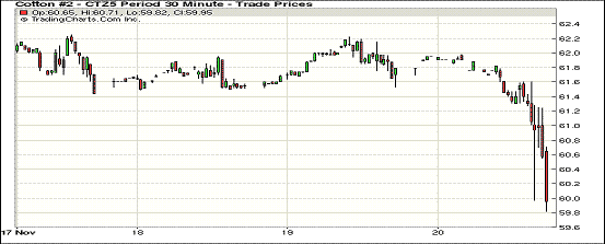 11月20日,紐約期棉重現(xiàn)弱勢(shì)調(diào)整格局;1512月合約結(jié)算價(jià)60.04美分/磅,跌154點(diǎn),1603月合約62.83美分,跌29點(diǎn)。當(dāng)日主力合約高開低走,開盤后弱勢(shì)走低,盤中在買盤支撐下上漲,但收盤前回落。周五期棉延續(xù)震蕩走勢(shì),近月12月合約下跌幅度較大,全球棉花庫(kù)存壓力較大,短期內(nèi)繼續(xù)給棉價(jià)帶來壓力。