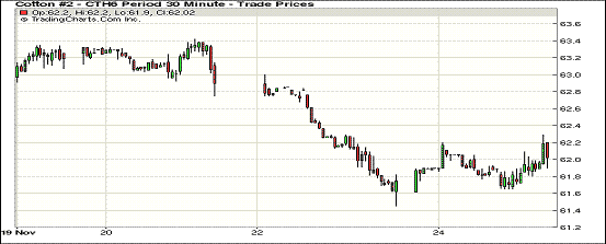 11月24日,紐約期棉全線小幅反彈;1512月合約結算價60.60美分/磅,漲44點,1603月合約61.94美分,漲34點。當日主力3月合約開盤后即開始上漲,全天保持漲勢,并最終小幅收高結束兩日連跌。至22日美棉采收進度70%,繼續(xù)落后去年和近五年同期,本周后期天氣不利采摘,期棉有望繼續(xù)回升。