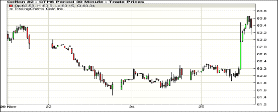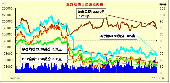 11月25日,預(yù)報稱未來德州降雨,利好因素刺激紐約期棉上漲;1512月合約結(jié)算價61.98美分/磅,漲138點;1603月合約收于63.28美分/磅,漲134點。當(dāng)日主力合約早間交易相對平穩(wěn),收盤前一小時受買盤刺激暴漲,最高至63.66美分/磅,最終收于震蕩區(qū)間上部。目前已進入美棉采收后期,有天氣預(yù)告稱未來幾天德克薩斯降雨,本就落后的采摘進度可能再次拖延,新花質(zhì)量將再次受到影響,市場高等級新花短缺,給棉價帶來一定支撐。