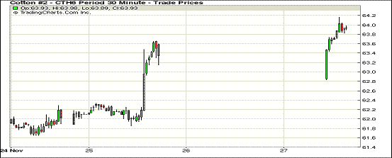 本周最后一個交易日紐約期棉全面小幅上漲;1512月合約結算價60.60美分/磅,漲44點,1603月合約61.94美分,漲34點。當日1603月合約低開高走,全天平穩(wěn)上漲,最高價突破64.00美分/磅。本周公布的美棉出口數(shù)據(jù)創(chuàng)年度新高,同時德州棉區(qū)降雨降溫,從而刺激買盤,當日隨美棉指數(shù)破百,但美棉期貨小幅走高。