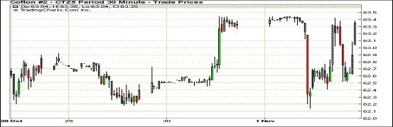 周一期棉價格小幅震蕩調整;1512月合約結算價63.29美分/磅,跌3點;1603月合約收于63.13美分/磅,漲13點。當日主力合約平開后走勢平穩(wěn),在63.40美分上下小幅浮動,之后下跌,盤中在62.40-62.80美分/磅震蕩。下半場交易起伏較大,主力合約反彈至63.40美分/磅后再次下跌至63美分以下,收盤前再次反彈。周一東南棉區(qū)暴雨,南部阿拉巴馬佐治亞和南、北卡羅萊納均受影響,德州降雨損害新花質量產量,給棉價帶來支撐,但目前美棉銷售進度依然緩慢。