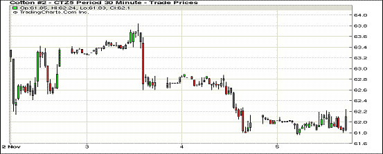 11月5日,美棉出口周報(bào)顯示最新簽約利好,當(dāng)日紐約期棉止跌企穩(wěn);1512月合約結(jié)算價(jià)61.95美分/磅,漲1點(diǎn);1603月合約收于62.13美分/磅,漲11點(diǎn)。當(dāng)日主力合約高開,全天處于窄幅震蕩走勢(shì),波動(dòng)區(qū)間僅40點(diǎn)。上周美棉簽約和裝運(yùn)走高,但中國簽約依然低迷利空棉價(jià),目前德州北部高地平原已出現(xiàn)霜凍天氣,個(gè)別地區(qū)降雨。