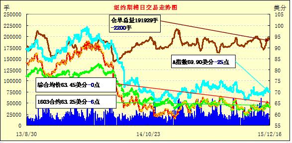 12月16日,紐約棉花期貨略有下跌,交投最活躍的3月合約下跌0.06美分,報收于63.25美分。美國聯(lián)邦公開市場委員會將指標(biāo)利率區(qū)間上調(diào)25個基點,至0.25%-0.5%,這是近10年來首次升息,這標(biāo)志著超寬松進期的結(jié)束,提振美元走高,對包括棉花在內(nèi)的大宗商品價格都有一定的負面影響,未來加息節(jié)奏的不確定性仍有可能引發(fā)市場動蕩,且棉市面臨的基本面形勢不佳,上周美國棉花周度銷售數(shù)據(jù)不佳,全球范圍內(nèi)棉花供應(yīng)過剩,市場基本面格局沒有明顯向好。紐約棉花期價繼續(xù)回落,連續(xù)五日陰跌,市場延續(xù)弱勢格局,有望繼續(xù)回落。