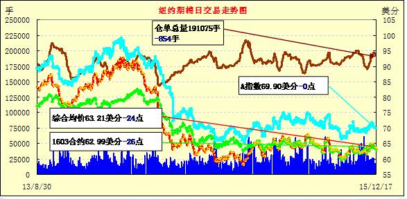 12月17日,美元指數(shù)在加息后上升,紐約期棉完成6連跌;1603月合約結(jié)算價62.99美分/磅,跌26點,1605月合約63.79美分,跌26點。當日3月合約延續(xù)低位小幅調(diào)整走勢,全天震蕩區(qū)間僅58點,早間交易稍有走強,午后下跌。美聯(lián)儲發(fā)布的加息消息給大宗商品帶來消極影響,最新美棉出口略有回升,但總體供需并沒有好轉(zhuǎn),在加息政策下,棉價或繼續(xù)走弱。