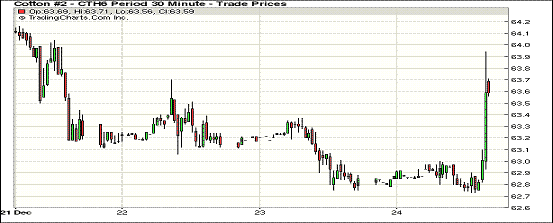 周四多方因素支撐紐約期棉反彈上漲,主力合約小幅收復(fù)近三日來(lái)的跌幅;1603月合約結(jié)算價(jià)63.66美分/磅,漲89點(diǎn),1605月合約64.35美分/磅,漲79點(diǎn)。當(dāng)日紐約期棉止跌反彈,主力合約開(kāi)盤(pán)后走勢(shì)平穩(wěn)但收盤(pán)前開(kāi)始蓄力上漲,最終收復(fù)近三日的跌幅。圣誕節(jié)前夕,美棉出口數(shù)據(jù)利好,德州棉區(qū)現(xiàn)極端天氣,美棉指數(shù)下跌等因素造成ICE期棉結(jié)束連日的陰跌上漲,但交投依然保持清淡。