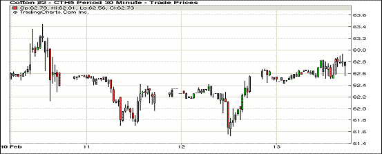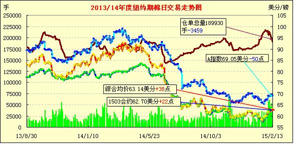2月13日受買(mǎi)盤(pán)影響紐約期棉繼續(xù)上漲;1503月合約結(jié)算價(jià)62.70美分/磅,漲22點(diǎn),主力1505月合約收于63.32美分/磅,漲51點(diǎn)。當(dāng)日開(kāi)盤(pán)后主力5月合約平穩(wěn)上漲,全天震蕩幅度較小,開(kāi)盤(pán)價(jià)和最低價(jià)均為62.80。當(dāng)日漲幅0.81%,3/5月合約價(jià)差62點(diǎn)。本周最后一個(gè)交易日紐約期棉收漲,當(dāng)周主力合約上漲59點(diǎn),短期內(nèi)棉價(jià)有望繼續(xù)上漲,主力合約挑戰(zhàn)64美分一線。