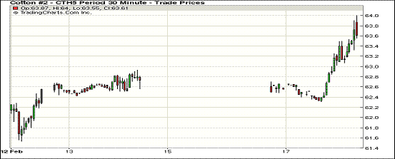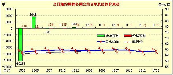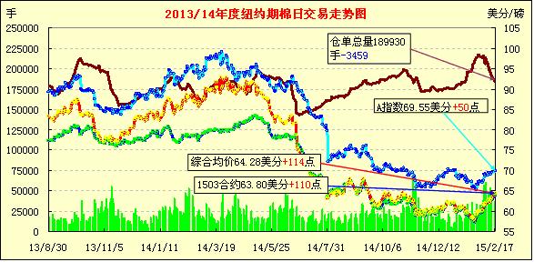 2月17日紐約期棉大漲,主力合約挑戰(zhàn)64美分成功;1503月合約結(jié)算價(jià)63.80美分/磅,漲110點(diǎn),主力1505月合約收于64.53美分/磅,漲121點(diǎn)。當(dāng)日開盤后主力5月合約小幅震蕩下行,午間跌至當(dāng)日最低價(jià)62.93,之后沖高,臨近收盤時(shí)達(dá)到64.74,最終漲幅1.91%3/5月合約價(jià)差73點(diǎn)。當(dāng)日美元承壓、空頭回補(bǔ)合力推動(dòng)紐約期棉上漲,市場利好消息基本消化,后續(xù)若無利好消息刺激,棉價(jià)難以維持。