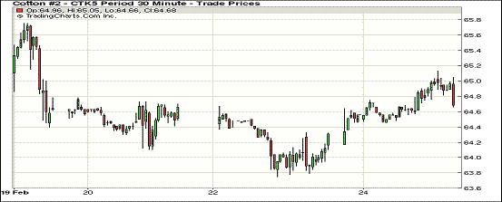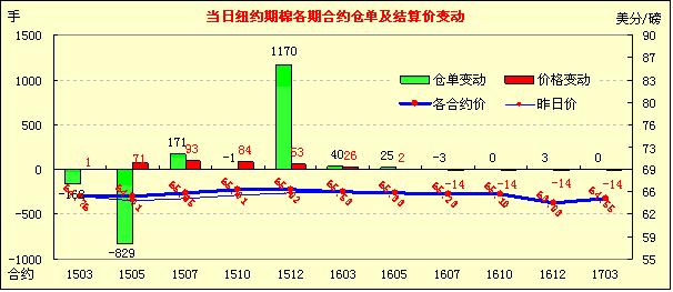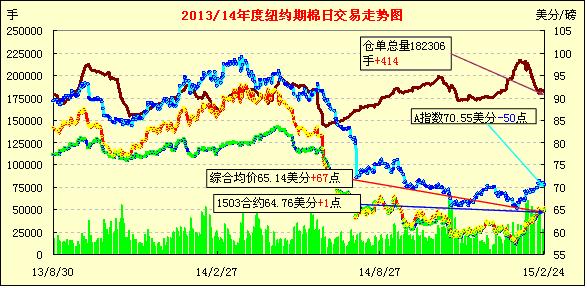 由于再次受到空頭回補,周二紐約期棉合約上漲;近期1503月合約結(jié)算價64.76美分/磅,漲1點,主力1505月合約收于64.91美分/磅,漲71點。當日主力合約開盤后上漲,但很快跌至當日最低價,之后觸底反彈上漲,最終漲幅1.10%。3/5月合約價差15點。春節(jié)期間,主力5月合約最高收盤價達到65.75美分/磅,登記庫存保持在低位,多方預(yù)測新年度行情樂觀,但印度方面缺乏利好消息,CCI競賣將繼續(xù)短期支撐棉價。