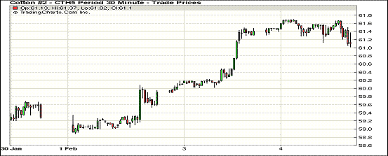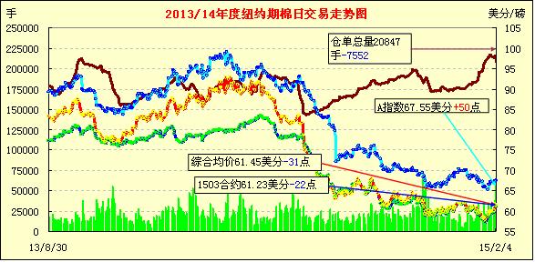 2月4日,由于外圍市場(chǎng)商品普遍下挫,期棉未能延續(xù)反彈走勢(shì)小幅收跌;主力3月合約收于61.23美分/磅,跌22點(diǎn);1505月合約61.32美分/磅,跌41點(diǎn)。受玉米、大豆和原油期貨下跌影響,紐約期棉當(dāng)日高開(kāi)低走,主力3月合約盤(pán)終前跌至61點(diǎn)位附近,盤(pán)終小幅反彈仍收跌22點(diǎn);美元指數(shù)上漲,市場(chǎng)成交量連續(xù)三日交易活躍。受本年度棉價(jià)持續(xù)走低影響,ICAC預(yù)測(cè)下年度全球棉花種植面積下降6%,但本年度美棉和印度儲(chǔ)備尚未消化前,國(guó)際棉價(jià)反彈仍存在極大壓力。