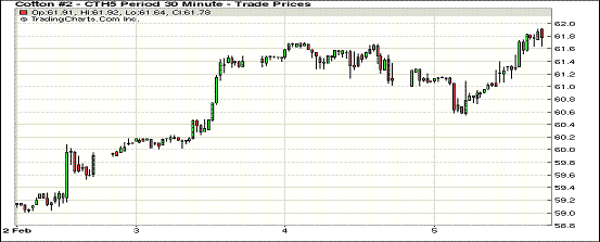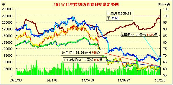 2月5日,受美棉簽約出口數(shù)據(jù)利好支持,紐約期棉近期合約止跌反彈小幅收漲;主力3月合約收于61.79美分/磅,漲56點(diǎn);1505月合約61.80美分/磅,漲38點(diǎn)。當(dāng)日期棉近期合約低開后穩(wěn)步上漲,午盤后受美棉出口報(bào)告利好支撐再度上漲,盤終主力合約收漲56點(diǎn),達(dá)到近五周來高位;外部谷物市場大豆和原油期貨上漲,3/5月價(jià)差僅1點(diǎn)。1.23-1.29一周美國凈簽約出口本年度陸地棉95890噸,裝運(yùn)63889噸;數(shù)據(jù)良好對棉價(jià)形成短期支撐。