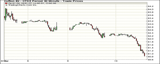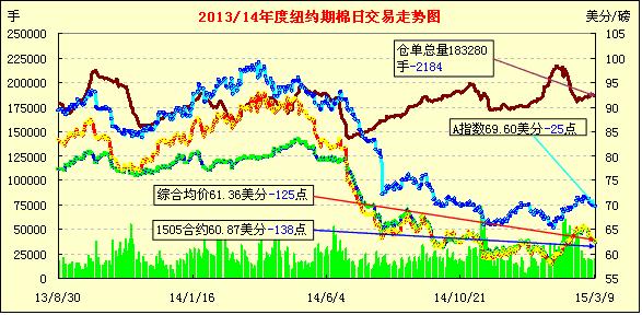 3月10日,紐約期棉在USDA報(bào)告發(fā)布后快速下跌,近期合約跌幅均在百點(diǎn)以上;近期3月合約收于60.87美分/磅,跌138點(diǎn);主力1505月合約61.46美分/磅,跌132點(diǎn)。當(dāng)日期棉開盤后延續(xù)前一日走勢(shì)震蕩下行,USDA報(bào)告總體利空對(duì)棉價(jià)形成進(jìn)一步打壓,盤終期棉大幅收跌,主力合約創(chuàng)五周低點(diǎn),市場(chǎng)成交量大幅上升;外部谷物市場(chǎng)小麥和油籽期貨下跌。據(jù)美國(guó)農(nóng)業(yè)部(USDA)最新發(fā)布的3月份全球棉花供需預(yù)測(cè)報(bào)告,2014/15年度全球棉花總產(chǎn)2596.2萬(wàn)噸,相比上月調(diào)減2.9萬(wàn)噸;全球消費(fèi)量2415.9萬(wàn)噸,調(diào)減6.4萬(wàn)噸。近期利空消息不斷對(duì)期棉形成壓力,繼續(xù)關(guān)注60美分/磅點(diǎn)位。