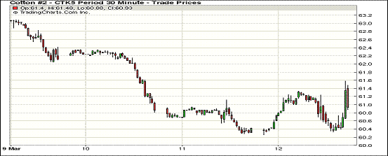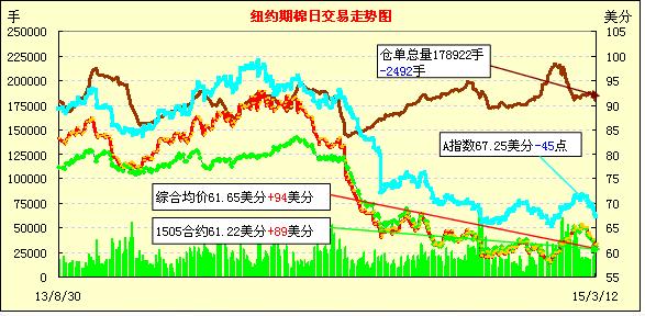 3月12日,受美棉出口數(shù)據(jù)利好支持,紐約期棉結(jié)束十連跌,遠(yuǎn)近合約中幅收漲;主力1505月合約收于61.22美分/磅,漲89點;1507月合約61.90美分/磅,漲90點。當(dāng)日期棉開盤后短暫下跌至60.26美分/磅低點,此后在美棉出口數(shù)據(jù)發(fā)布后震蕩上行,主力合約盤終收漲89點,在經(jīng)歷月初中國和土耳其大幅取消訂單后,受近期棉價持續(xù)下跌支撐,預(yù)計下周出口數(shù)據(jù)將明顯好轉(zhuǎn)。2.27-3.5一周美國凈簽約出口本年度陸地棉8346噸;裝運(yùn)69808噸;均較前一周大幅增加。