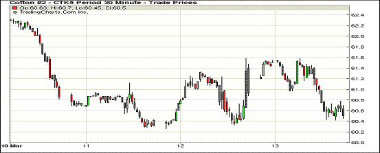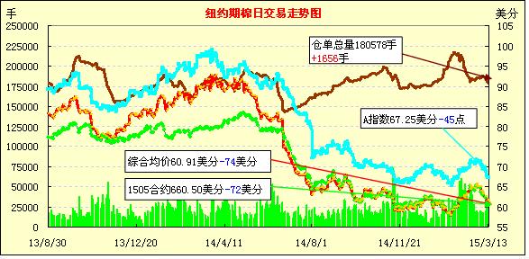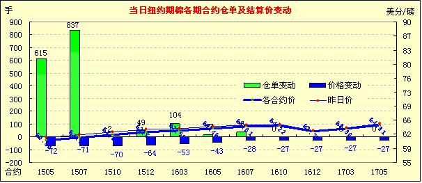 由于缺乏利好消息周五紐約期棉再次收跌,在過(guò)去的12個(gè)交易日內(nèi)僅1日收漲;1505月合約結(jié)算價(jià)60.50美分/磅,跌72點(diǎn),主力1507月合約收于61.19美分/磅,跌71點(diǎn)。當(dāng)日主力合約開(kāi)盤(pán)后小漲,至當(dāng)日最高價(jià)61.58美分/磅,午間休盤(pán)前下跌最終收跌,跌幅1.18%。7/12月合約價(jià)差140點(diǎn)?,F(xiàn)貨市場(chǎng)隨期棉連跌逐漸復(fù)蘇,上周美棉出口略有好轉(zhuǎn),印度棉競(jìng)賣(mài)挺價(jià),目前ICE期棉雖成跌勢(shì),但強(qiáng)力支撐依然在。