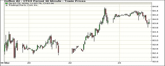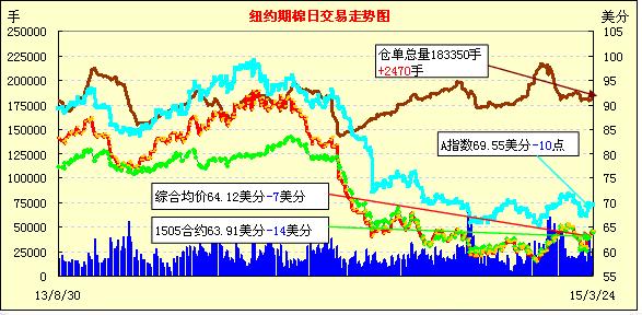 3月24日紐約近月合約小幅回落,但大部分合約依然保持漲勢;主力1505月合約結算價63.91美分/磅,跌14點,1507月合約收于64.38美分/磅,跌4點。當日市場買盤冷卻,主力合約早盤上漲,但隨后結束上漲趨勢并小幅收跌,跌幅0.22%。5/7月合約價差47點。