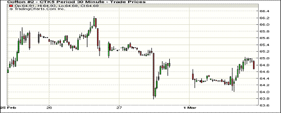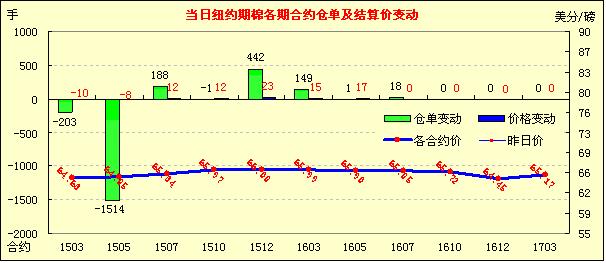 3月首個交易日,除近期3月和5月合約小幅下跌外,其他合約多微幅上漲;近期3月合約收于64.63美分/磅,跌10點(diǎn);主力1505月合約64.85美分/磅,跌8點(diǎn)。當(dāng)日期棉開盤后微幅波動調(diào)整,近期合約雖低開高走,盤終前受玉米和大豆等谷物市場期貨拖累小幅收跌,美元指數(shù)上漲;當(dāng)日市場相關(guān)棉花消息有限,市場成交量下滑。期棉近期連續(xù)上漲,關(guān)注主力合約65美分/磅一線;上周美國棉區(qū)遭遇寒冷天氣襲擊,德州平原已分檢423萬包,南部地區(qū)進(jìn)度受到影響,三角州北部棉區(qū)干旱。