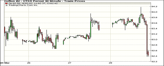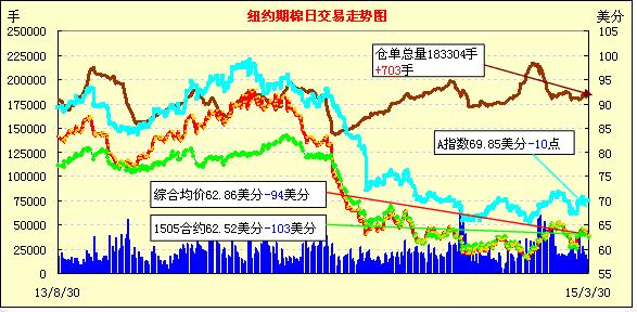 周一美元指數(shù)上漲,紐約期棉承壓下挫,全線飄綠;主力1505月合約結(jié)算價62.521美分/磅,跌103點;遠(yuǎn)期1507月合約收于63.00美分/磅,跌87點。當(dāng)日主力合約平開,全天走勢小幅震蕩,上行空間較小,最高價64.18美分/磅,臨近收盤時跳水下跌,收盤價僅高于最低價15點。7/12月合約價差49點。