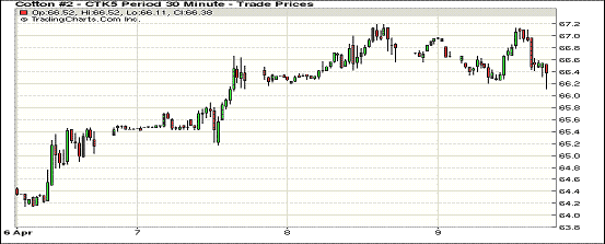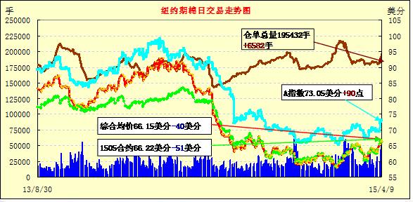 4月9日,紐約期棉近月合約小幅回落;1505月合約結(jié)算價(jià)66.22美分/磅,跌51點(diǎn),1507月合約收于66.13美分/磅,跌33點(diǎn)。當(dāng)日主力合約高開后下跌,盤中跌入最低點(diǎn)66.11美分/磅,但當(dāng)日震蕩幅度不大,最高價(jià)依然在67美分以上。7/12月合約價(jià)差9點(diǎn)。最新美棉出口量繼續(xù)減少,裝運(yùn)量和皮馬棉簽約量均創(chuàng)年度新高,之后美國農(nóng)業(yè)部供需平衡表發(fā)布,小幅上調(diào)美棉產(chǎn)量和年末庫存。
