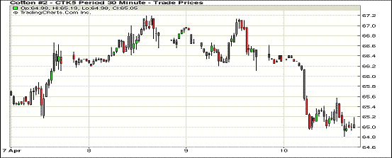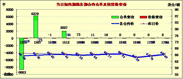 4月10日,紐約期棉繼續(xù)回落,成交量突破6萬;1505月合約結(jié)算價(jià)65.06美分/磅,跌116點(diǎn);1507月合約收于65.40美分/磅,跌73點(diǎn)。當(dāng)日合約高開低走,早間跌勢(shì)強(qiáng)勁,跌至65美分/磅左右后走勢(shì)趨于平穩(wěn),最低價(jià)64.81美分/磅,全天跌幅1.75%。7/12月合約價(jià)差21點(diǎn)。WASDE預(yù)測(cè)2014年產(chǎn)量調(diào)增22萬包,期末庫(kù)存調(diào)增20萬包,至440萬包,為2008/09年度以來最高期末庫(kù)存。