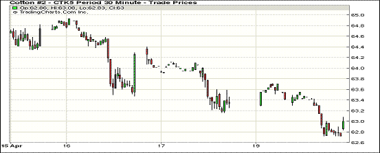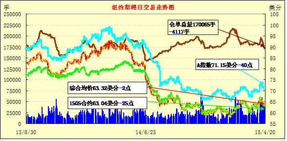 4月20日,紐約期棉小幅波動,收盤價與前一交易日基本持平,近期1505月合約結算價63.04美分/磅,跌25點,主力1507月合約收于63.39美分/磅,漲10點,1512月合約63.37美分,跌6點。當日7月合約上半場交易在63.4美分一線運行,盤中受整體商品市場下跌打壓中心下移,交易后期在63美分處獲得支撐反彈,最終以小跌收盤。