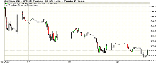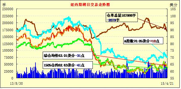 4月21日紐約期棉弱勢依舊,近期1505月合約結(jié)算價62.63美分/磅,跌41點,主力1507月合約收于62.99美分/磅,跌40點,1512月合約63.05美分,跌32點。當(dāng)日7月合約交易意圖明顯,試圖在63美分獲得支撐,整日交易最大幅度僅62點,最終該合約收于62.99美分。
