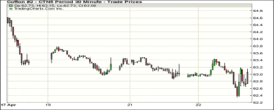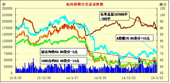 4月22日紐約期棉微幅盤整,近期1505月合約結(jié)算價(jià)62.49美分/磅,跌14點(diǎn),主力1507月合約收于62.92美分/磅,跌7點(diǎn),1512月合約63.23美分,漲18點(diǎn)。當(dāng)日7月合約早盤小幅走高,在63.4美分一線遇到阻力窄幅盤整,交易后期因缺乏上漲動(dòng)能最低下跌至62.4美分,交易后期圍繞63美分進(jìn)行波動(dòng),最終微幅收跌。