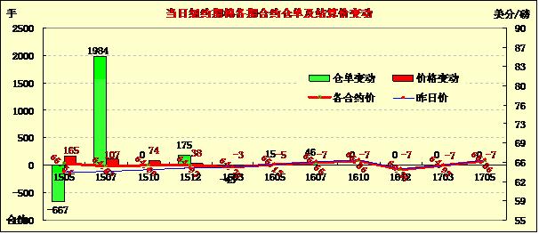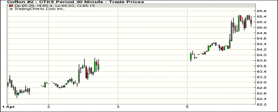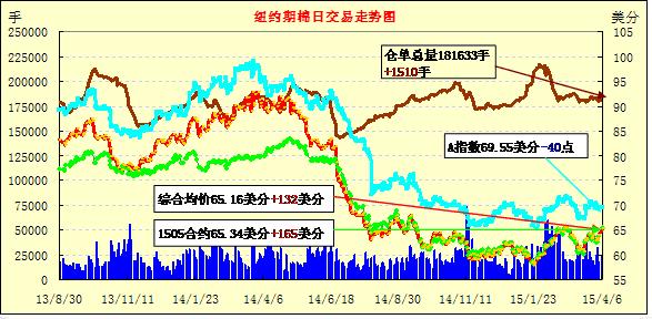 4月6日紐約期棉近漲遠跌,5/7月合約上漲超100點;1505月合約結算價65.34美分/磅,漲165點,1507月合約收于64.87美分/磅,漲107點。當日主力合約高開后下跌,并很快跌入當日最低價63.75美分/磅,之后震蕩上漲,最高價65.46美分/磅,略高于收盤價。全天漲幅2.59%。7/12月合約價差15點。截至目前美棉種植者簽約植棉面積僅為預計種植面積的1%,德州Rio Grande種植區(qū)潮濕影響種植,陸地棉貸款下跌13萬包。