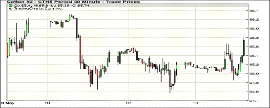 5月13日美元指數(shù)創(chuàng)三個(gè)月新低,商品價(jià)格普遍走高,紐約期棉全線上漲;1507月合約結(jié)算價(jià)65.77美分/磅,漲75點(diǎn);主力1512月合約收于65.79美分/磅,漲96點(diǎn)。當(dāng)日7月合約高開,早間震蕩幅度僅上下波動(dòng)10點(diǎn)不到,下半場(chǎng)走勢(shì)大起大落,臨收盤時(shí)達(dá)到最高價(jià)65.80美分/磅,收于65.77美分/磅,漲幅1.15%。美國農(nóng)業(yè)部最新預(yù)測(cè)稱下年度世界期末庫存將為2009/10年度以來首次減少,但預(yù)測(cè)本年度產(chǎn)量僅小幅減少,期末庫存繼續(xù)增加。