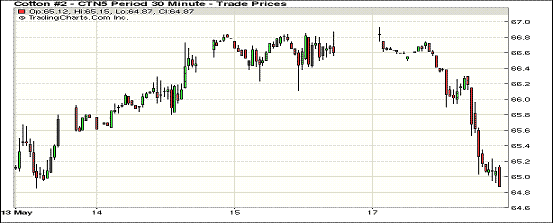 5月18日賣盤壓力重現(xiàn),紐約期棉全線大跌,主力合約下跌近200點;1507月合約結算價64.92美分/磅,跌192點;1512月合約收于65.18美分/磅,跌164點。當日主力合約早盤跌勢較緩,下半場交易兩次直線下跌,最終收于當日低位,跌幅近3%。7/12月合約價差26點。