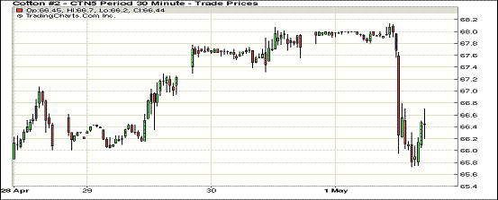 5月1日紐約期棉以弱勢(shì)為主,近月和主力合約下跌超百點(diǎn);1505月合約結(jié)算價(jià)66.85美分/磅,跌127點(diǎn);1507月合約收于66.61美分/磅,跌127點(diǎn)。當(dāng)日7月合約低開(kāi),早間交易走勢(shì)平穩(wěn),下半場(chǎng)驟然下跌,全天跌幅1.88%。7/12月合約價(jià)差縮小至16點(diǎn)。