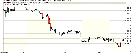 5月20日期棉繼續(xù)保持調(diào)整態(tài)勢(shì),合約價(jià)漲跌互現(xiàn);1507月合約結(jié)算價(jià)64.15美分/磅,跌20點(diǎn);1512月合約收于64.97美分/磅,漲14點(diǎn)。當(dāng)日主力合約以弱勢(shì)為主,全天震蕩下跌,雖然收盤前拉升但依然收跌,跌幅0.16%。7/12月合約價(jià)差擴(kuò)大,至82點(diǎn)。